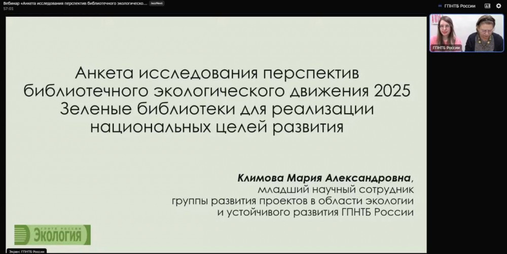 В вебинаре приняли участие более 60 человек. Эксперты вебинара – ведущий научный сотрудник, руководитель группы развития проектов в области экологии и устойчивого развития (ЭКОиУР) ГПНТБ России Елена Феликсовна Бычкова и младший научный сотрудник ЭКОиУР ГПНТБ России Мария Александровна Климова – рассказали о разработанной и представленной на сайте для заполнения «Анкеты исследования перспектив библиотечного экологического движения 2025. Зеленые библиотеки для реализации национальных целей развития».