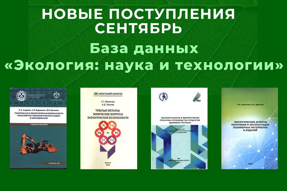 Приглашаем ознакомиться с новыми поступлениями в базу данных «Экология: наука и технологии»за сентябрь 2025 г. В сентябре БД пополнилась более чем на 250 записей. Среди них монографии, учебные и учебно-методические пособия, сборники научных трудов и статьи по актуальным достижениям в области решения экологических проблем.